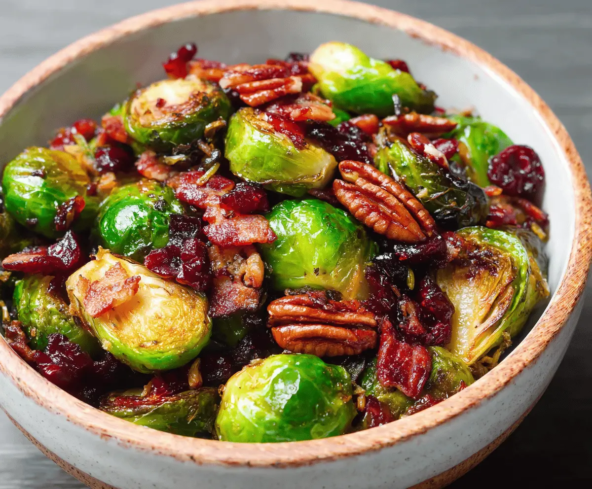 Brussels Sprouts with Bacon, Pecans, Cranberries, and Balsamic Glaze