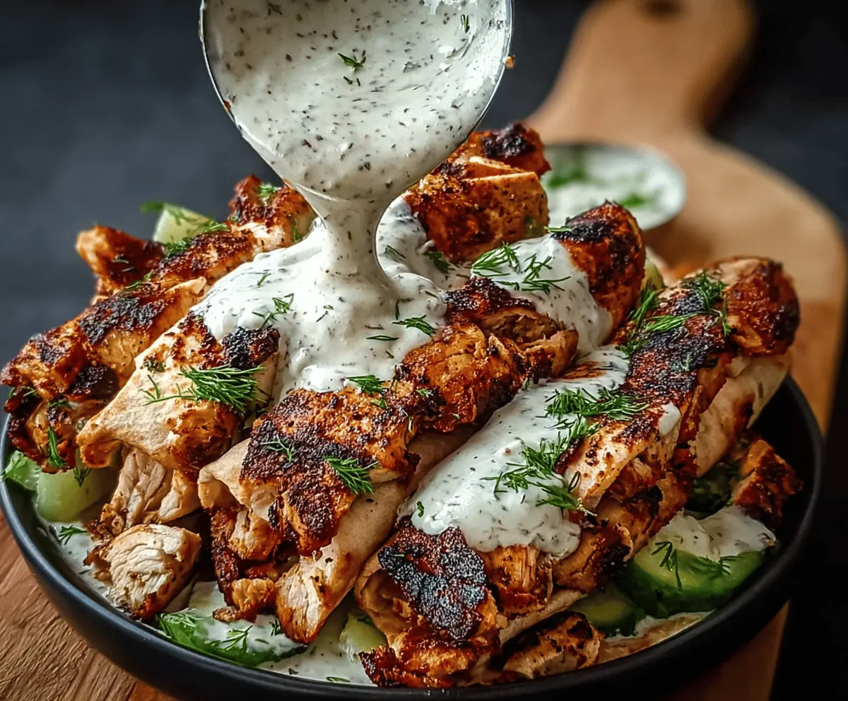 Pita Bread: Warm, soft pita wraps hold the chicken and sauce perfectly. You can substitute with flatbread, naan, or even tortillas if needed.