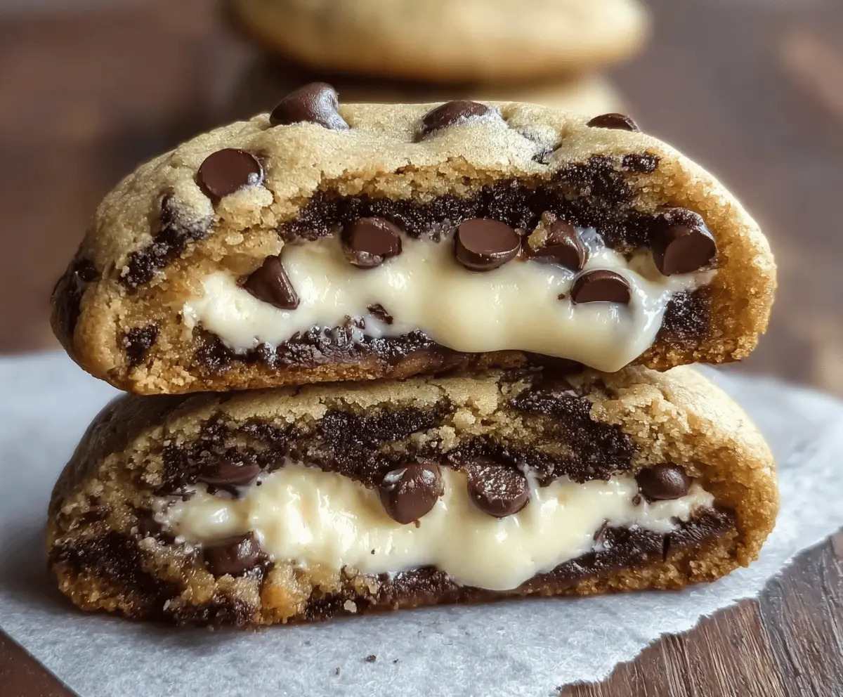 Chocolate Chip Cookies with Creamy Cheesecake Filling are a delightful treat that brings together the best of both worlds: soft, chewy cookies packed with melty chocolate chips and a smooth, rich cheesecake center. The cookies bake up golden and slightly crisp around the edges, making a perfect little sandwich with the creamy filling hiding inside.