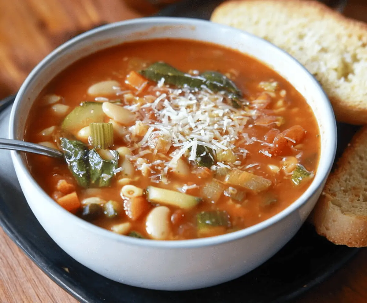 To me, minestrone tastes best served with a sprinkle of Parmesan cheese and a slice of crusty bread for dipping. I like to make a big pot so there’s plenty for leftovers—it actually tastes even better the next day! It’s a simple, classic soup that brings people together and feels like home with every spoonful.
