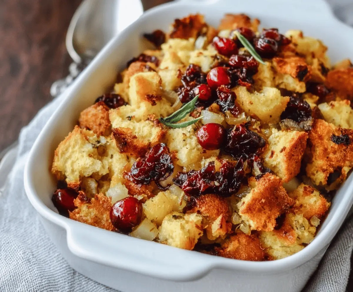 A bowl of fresh cranberry and apple stuffing garnished with herbs, ready to serve as a flavorful side dish for Thanksgiving or holiday meals.