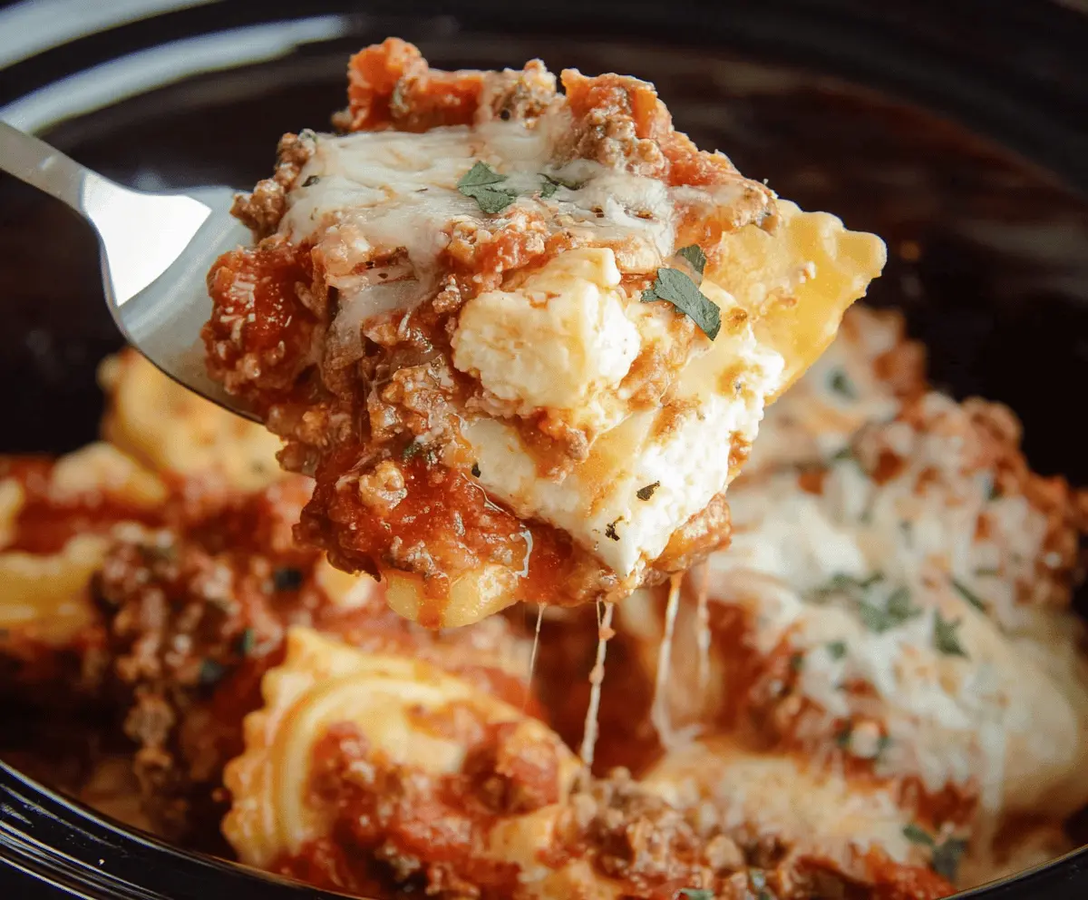 Delicious Crockpot Ravioli Lasagna served in a baking dish with melted cheese and fresh herbs, ready to enjoy