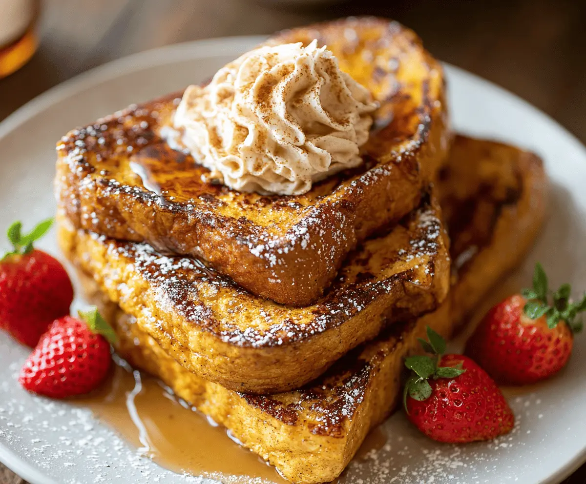 Stack the cooked French toast slices on a plate. Top with a generous dollop of whipped cream and dust with powdered sugar. Finish with a drizzle of warm maple syrup for that cozy fall touch. Serve immediately and enjoy!