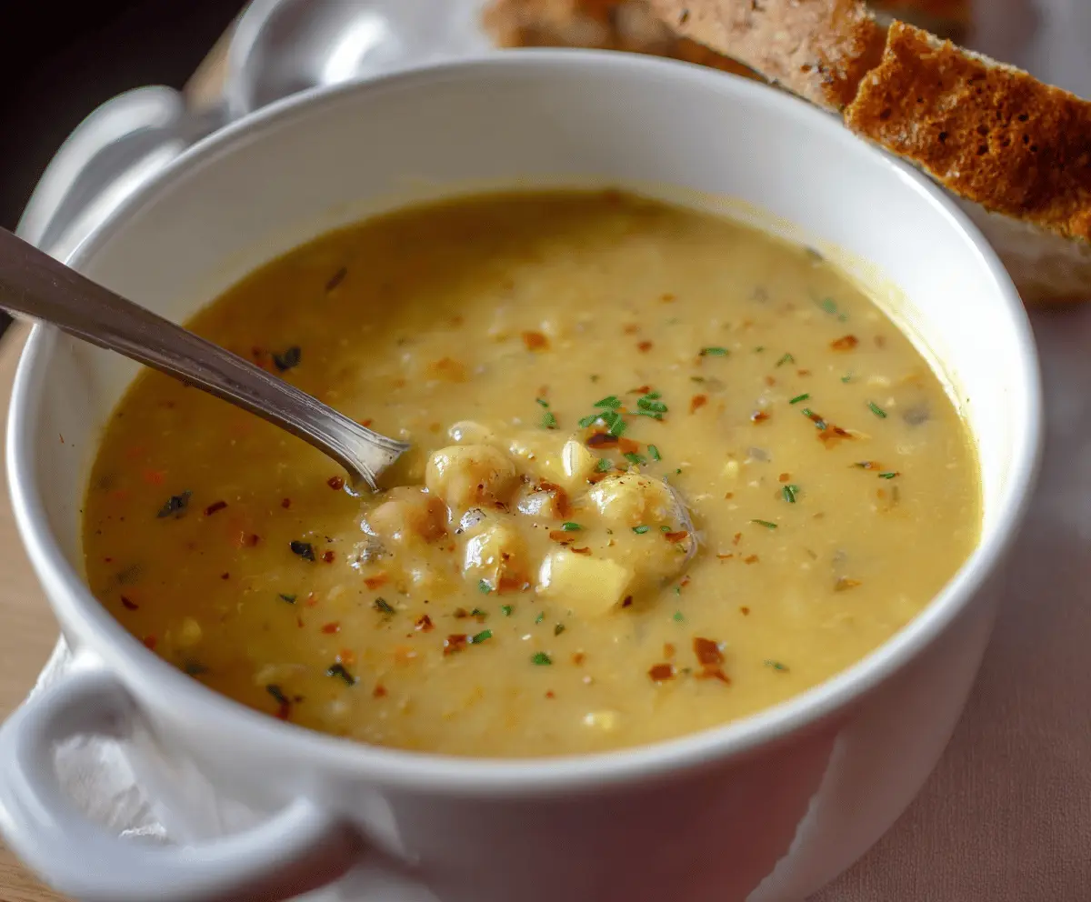 Garlic Chickpea Soup is a comforting bowl filled with creamy chickpeas, plenty of garlic, and a touch of warmth from spices. It’s simple, hearty, and has just the right balance of mild garlic flavor without being too strong. The soup has a smooth texture with little chickpea bites that make it satisfying every spoonful.