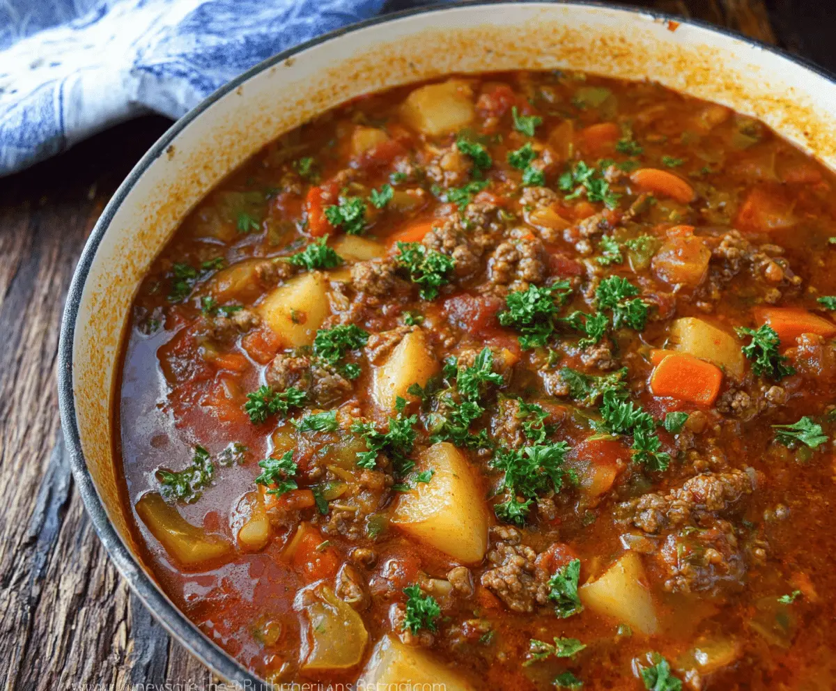 Hamburger Stew is a hearty and comforting dish that’s perfect for chilly days. It’s made with ground beef, tender vegetables like carrots and potatoes, and a rich, flavorful broth that all come together in one warm pot. The soft potatoes and juicy beef make each bite satisfying and filling.
