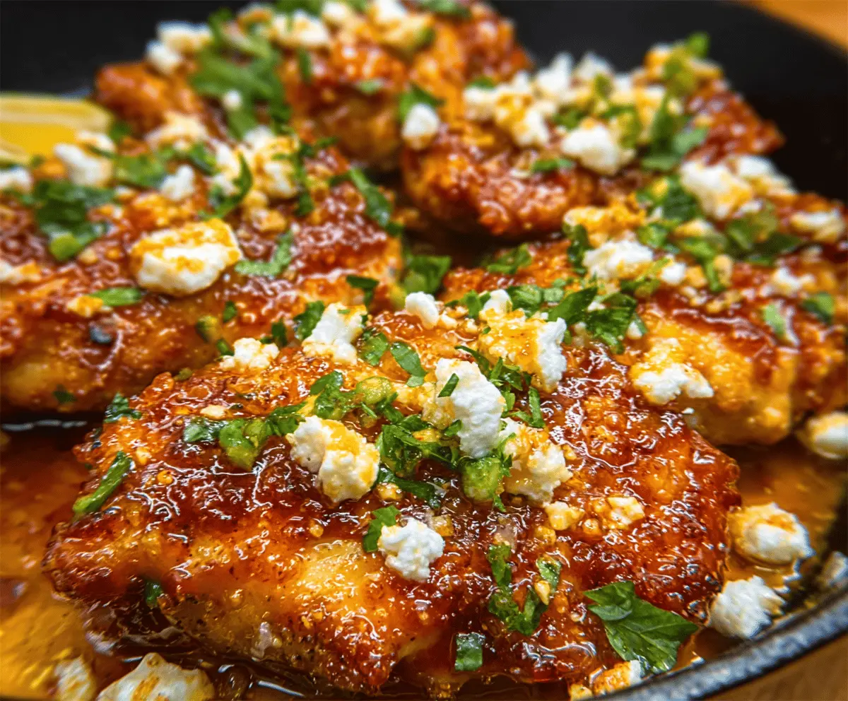 You can cook the chicken ahead and store it covered in the fridge for up to 2 days. Reheat gently in a skillet or microwave, then drizzle the hot honey sauce and sprinkle feta just before serving for best texture.