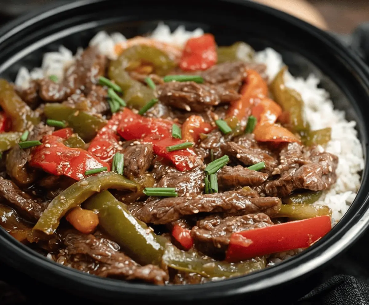 Delicious homemade Pepper Steak cooked in a Crock Pot, featuring tender beef, colorful bell peppers, and savory sauce.