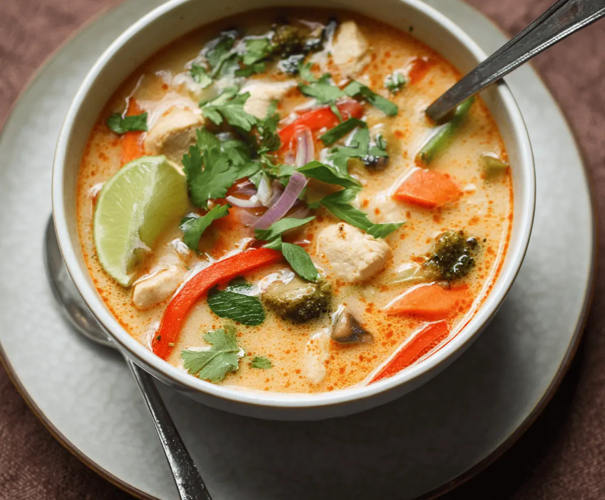 A bowl of Thai Chicken Soup garnished with fresh herbs, lime wedge, and sliced chili peppers, showcasing a flavorful, aromatic Asian-inspired dish.